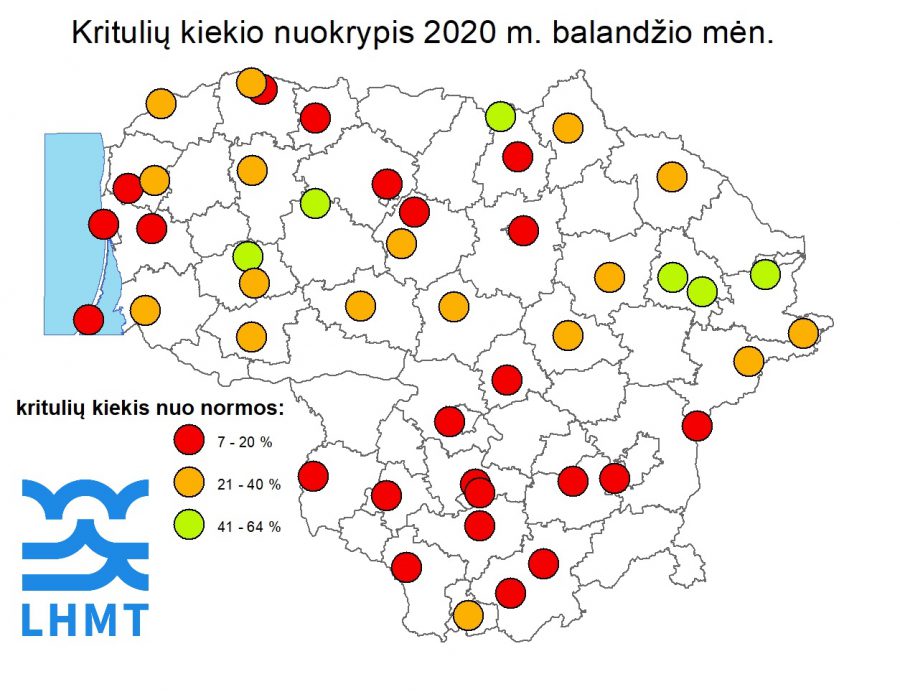 Paveiksle pavaizduota, kokia kritulių normos (SKN) dalis iškrito balandžio mėn. „Mažiausiai kritulių balandį sulaukė pietvakarinė Lietuvos dalis (iki 10 %), todėl čia formuojasi meteorologinė sausra. Jei gegužės mėn. 1 dešimtadienį kritulių taip pat sulauksime nedaug – meteorologinė sausra apims didesnę teritoriją. Jei ir 2 dešimtadienį – galime tikėtis ir stichinės sausros susiformavimo“, – teigė Lietuvos hidrometeorologijos tarnybos klimatologė Viktorija Mačiulytė.