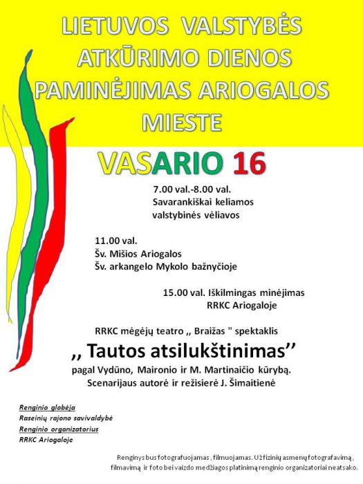 • 15.00 val. – iškilmingas minėjimas, skirtas Lietuvos valstybės atkūrimo dienai.