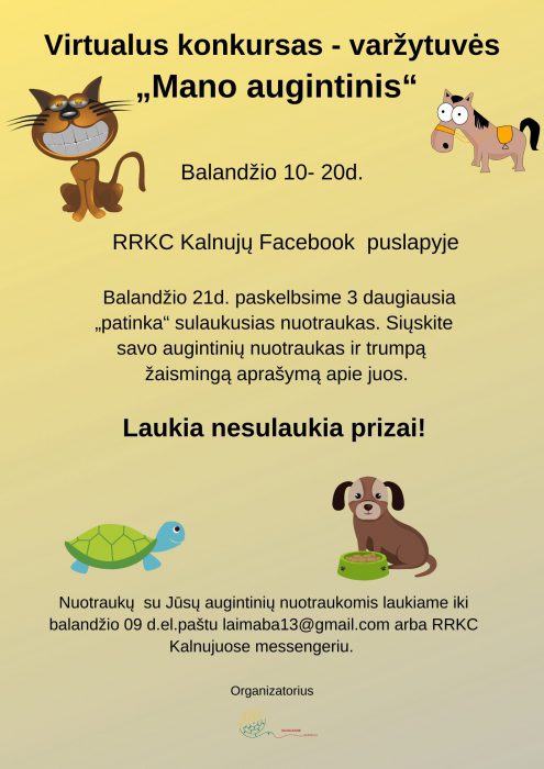 Virtualus konkursas – varžytuvės „Mano augintinis“. Laukiame Jūsų augintinių nuotraukų ir žaismingą aprašymą apie juos iki balandžio 9 d. Balandžio 21 d. paskelbsime 3 daugiausiai „patinka“ sulaukusias nuotraukas. Jūsų laukia prizai.